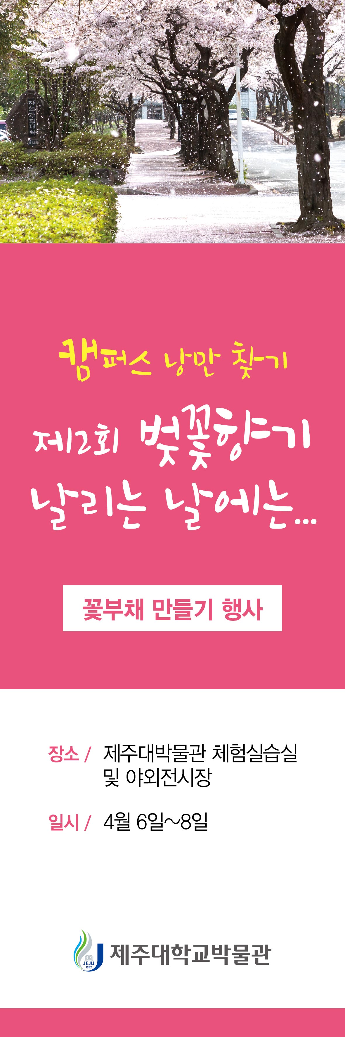 제주대학교박물관에서 제주 왕벚꽃이 만개하는 시기에 맞춰 캠퍼스에서 낭만과 추억을 만들 수 있는 문화행사를 마련했습니다. '벚꽃향기 날리는 날에는...' 행사에서는 냅킨아트와 캘리그라피를 이용한 '꽃부채' 만들기를 무료로 체험하실 수 있습니다.