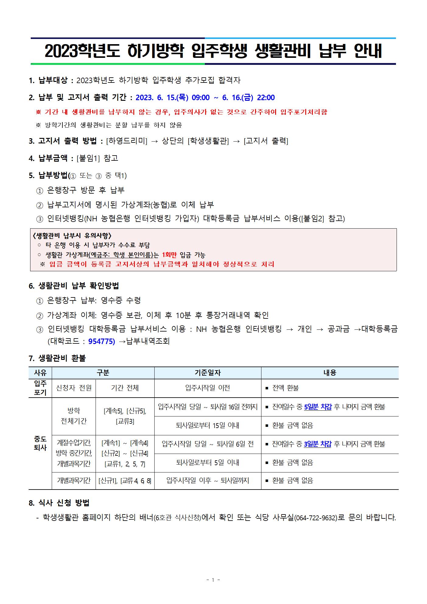 [ 부속기관 - 학생생활관 ] 2023학년도 하기방학 입주학생 생활관비 납부 안내
