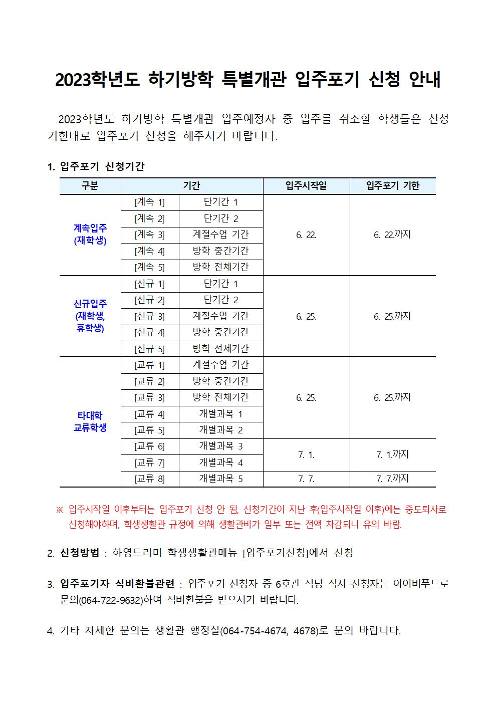 [ 부속기관 - 학생생활관 ] 2023학년도 하기방학 특별개관 입주포기 신청 안내