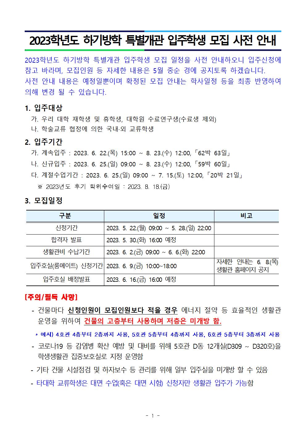 [ 부속기관 - 학생생활관 ] 2023학년도 하기방학 특별개관 입주학생 모집 사전 안내