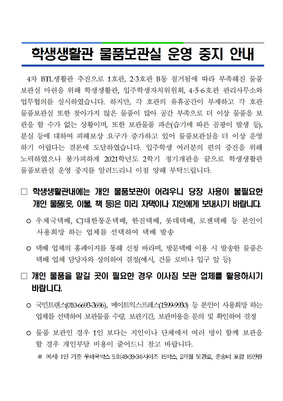 [ 부속기관 - 학생생활관 ] 학생생활관 물품보관실 운영 중지 안내(국문, English)