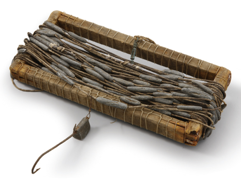 흘림갈치술(불림낚시 刀魚手釣具 / Hairtail trolling) / 금속+면사+나무 / 근대 / 길이 30.5 야간에 배를 조금씩 움직여가며 갈치를 낚는 끌낚시 도구이다. 낚시줄을 감아두는 얼레인 차세와 줄, 줄봉돌, 훼롱, 아릿줄, 낚시로 구성되어진다.