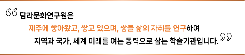 지역학 연구는 지역 역사, 문화, 정치, 경제, 사회, 지리 등을 포괄하여 지역과 관련된 제반 사항을 지역 입장에서 분석하되, 지역과 지역 사람 성향과 특질을 해명하고, 삶의 자취와 자료를 집대성하여 미래를 열어가는 동력으로 삼아야 한다고 말합니다. 1967년 설립 이래 우리 탐라문화연구원은 한 번도 이 점을 잊은 적이 없습니다.
